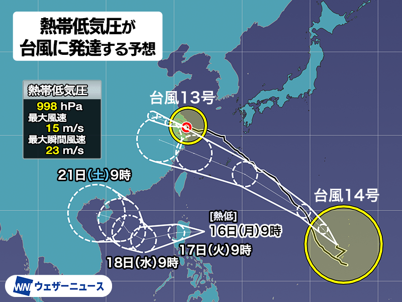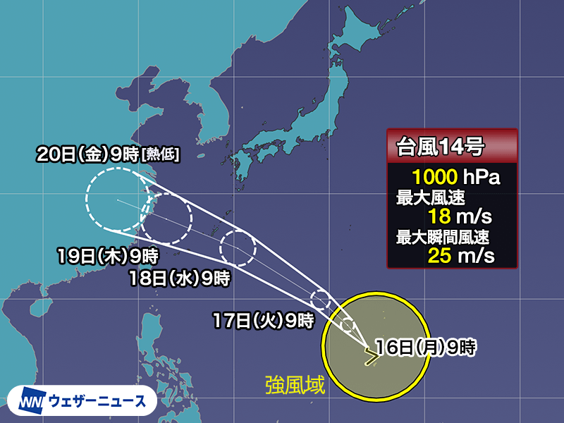 台風14号の進路予想を見ると、台風13号の経路をたどるように日本の南を北西に進み、明後日18日(水)に沖縄付近を通過して東シナ海に向かう予想となっています。