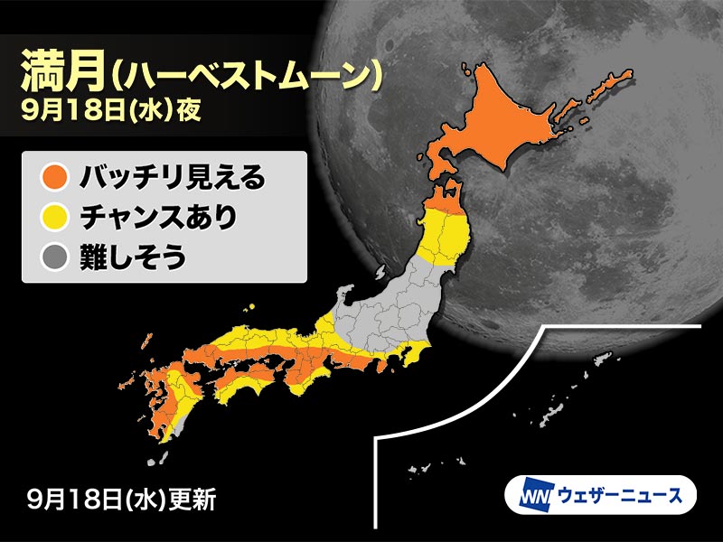 西日本のその他の地域や、北海道・東北北部などでは雲が少なく、お月見を楽しめるところが多くなる予想です。