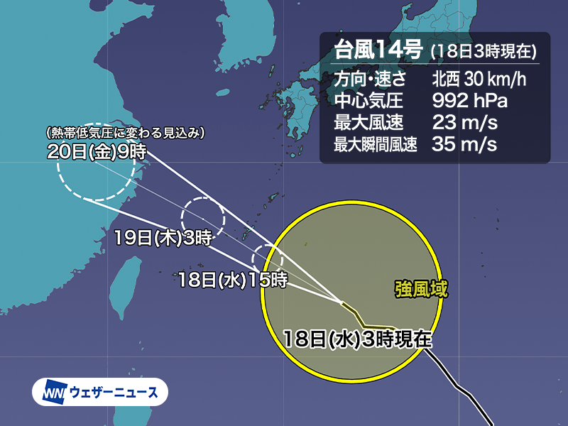 台風14号は移動速度が早く、時速35km程度で沖縄付近を通過する予想です。このため、沖縄や奄美では急に風が強まり、天気が崩れてくるので注意が必要です。