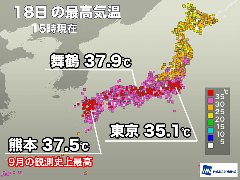15時時点で35℃を超えた猛暑日地点は128地点となり、9月12日(木)以来6日ぶりに100地点を超えました。猛暑日地点は関東から九州の広範囲に分布しています。最も高い最高気温は京都府舞鶴の37.9℃。熊本(37.5℃)や長崎(36.5℃)は9月としては観測史上最高の気温となりました。東京(35.1℃)や名古屋(36.4)でも猛暑日となり、観測史上最も遅い猛暑日となっています。