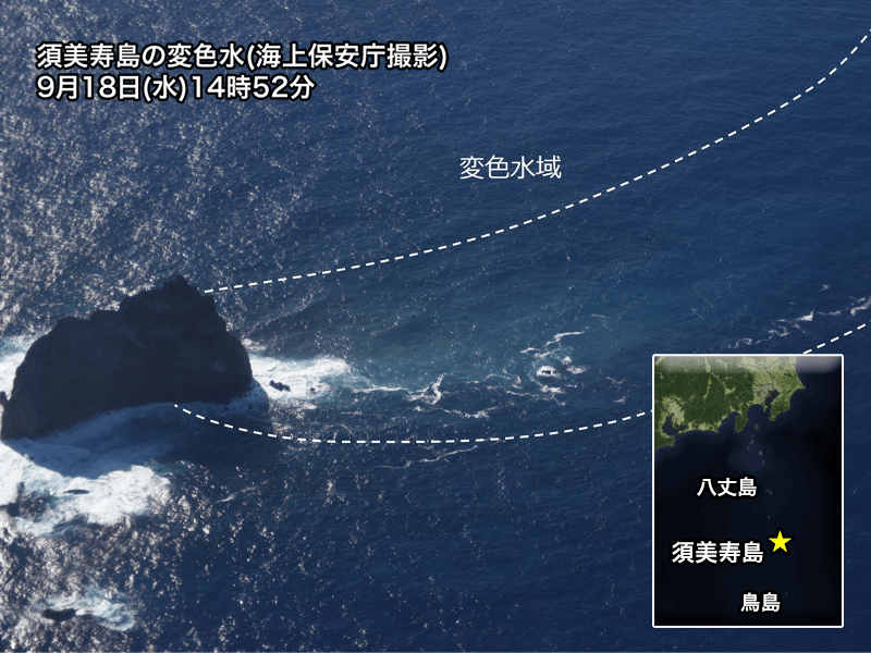 海上保安庁が昨日(18日)実施した上空からの観測によると、須美寿島(北緯31度26.3分、東経140度03.0分、青ヶ島の南約110km)付近で、7月に続いて変色水が確認され、須美寿島の北岸より北西約1800mにかけて広がっているのが認められました。