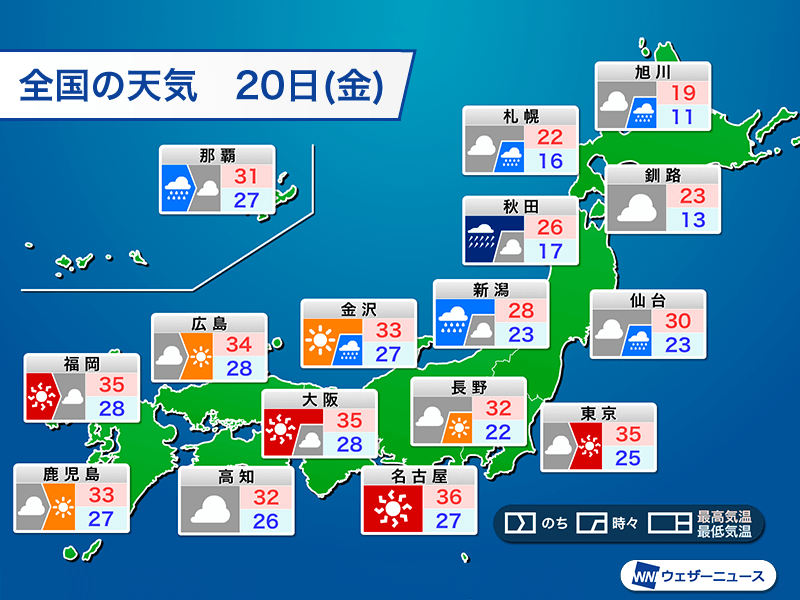 ただ、明後日21日(土)になると秋雨前線が南下して天気が崩れるため、猛烈な残暑もようやく終わりを迎えます。