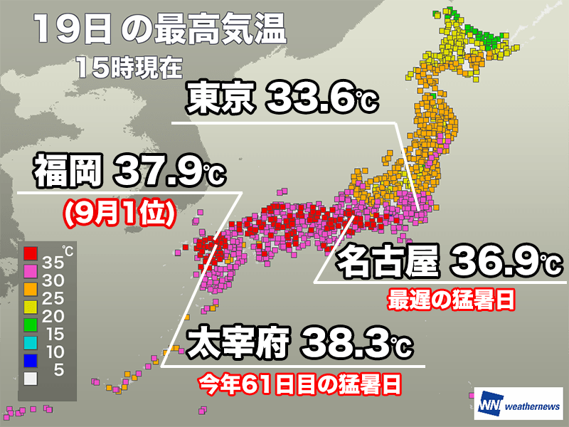 15時00分までの最高気温は全国で最も高くなった福岡県太宰府市で38.3℃を観測。今年の猛暑日は61日目で、年間の日本最多記録を今日も更新しています。太宰府市のほか、4地点で38℃以上を記録。37.9℃まで上がった福岡市や佐賀市など、20地点以上で9月の観測史上1位の暑さとなりました。