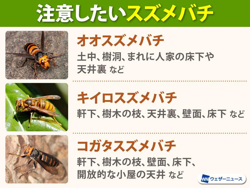 「キイロスズメバチは樹木の枝のほか、民家の軒下などにも巣を作ります。コガタスズメバチも樹木の枝や軒下に巣を作ります。