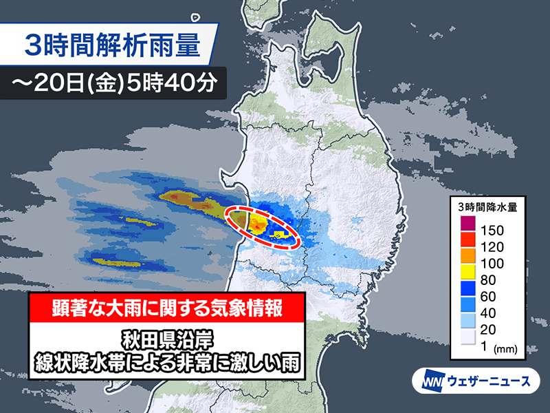 秋雨前線の南側で湿った空気の流れ込みが強まっている秋田県沿岸付近では、日本海から連なる積乱雲の影響で非常に激しい雨が降り続き、3時間に120mmを超える雨が降ったとみられ、土砂災害や河川の氾濫が発生するおそれが急激に高まっています。