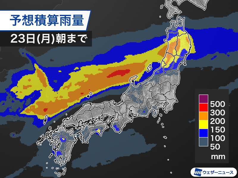 これから23日(月)朝までの雨量は、東北日本海側や北陸の多い所で200mm以上に達する予想です。すでに100mm以上の雨の降っている所がありますので、総雨量が300mm前後の大雨になる可能性があります。