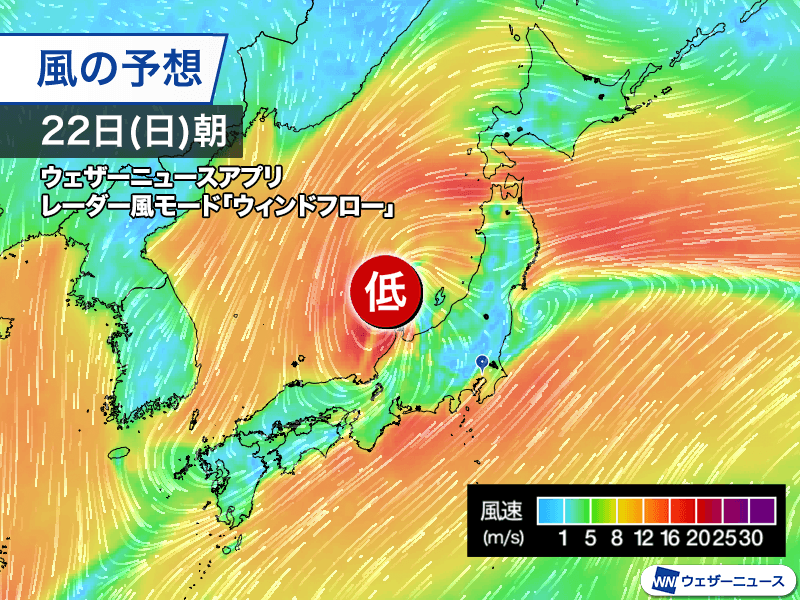 低気圧が日本海を進むに連れて風の強い範囲は拡大していきます。低気圧と高気圧との間の気圧差が大きくなるため、西日本から関東の太平洋側では南西の風、東北北部や北海道では東寄りの風がそれぞれ強く吹く見通しです。