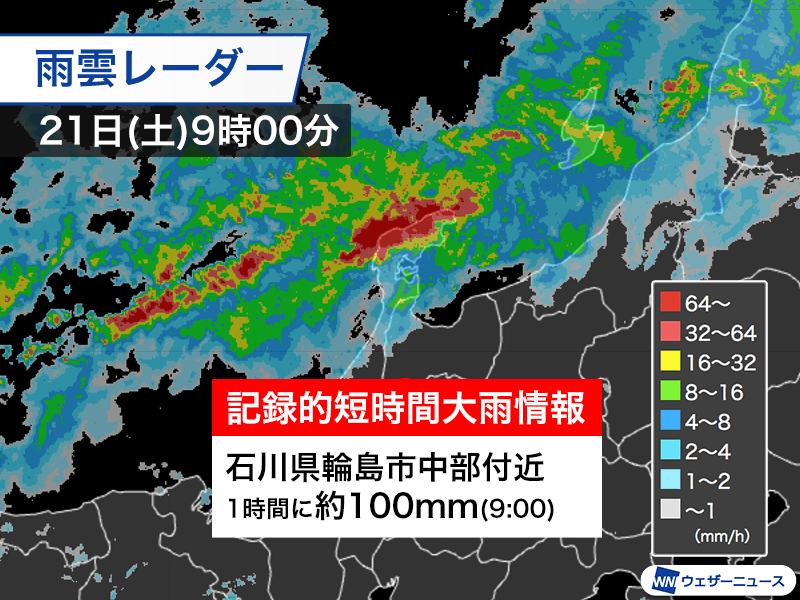 石川県で1時間に約100mmの猛烈な雨 記録的短時間大雨情報