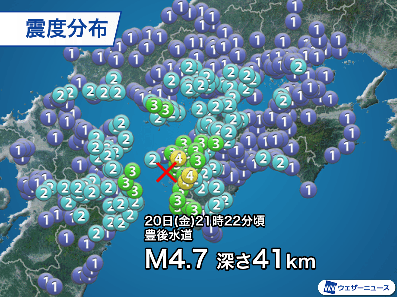 20日(金)21時22分頃、豊後水道を震源とするマグニチュード4.7、深さが41kmと推定される地震が発生しました。この地震で愛媛県宇和島市と八幡浜市で最大震度4、大洲市、西予市、伊予市、高知県宿毛市、大分県大分市、臼杵市、山口県周防大島町などで震度3の揺れを観測しました。