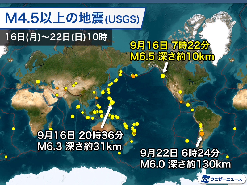 アメリカ地質調査所の解析によるマグニチュード6以上の地震は3回発生しました。最も大きな地震はカナダ沖の太平洋で発生したマグニチュード6.5です。