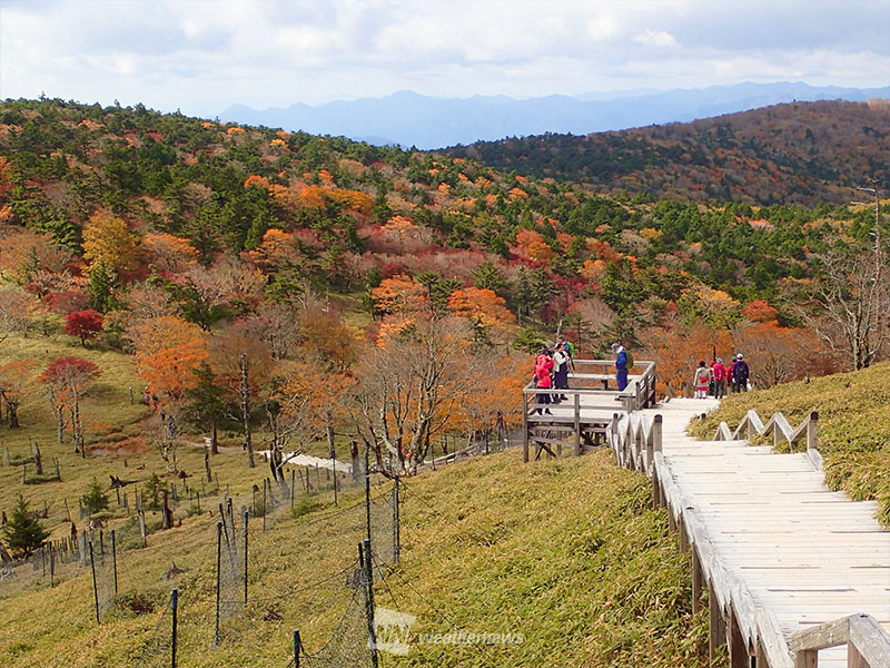 奈良県と三重県にまたがる大台ヶ原山は、日本百名山にも指定されている山です。その最高点でもある日出ヶ岳の展望台からは、360度パノラマの風景が望め、紅葉の時期にはワインレッド色に染まったシロヤシオが正木峠方向に見えます。