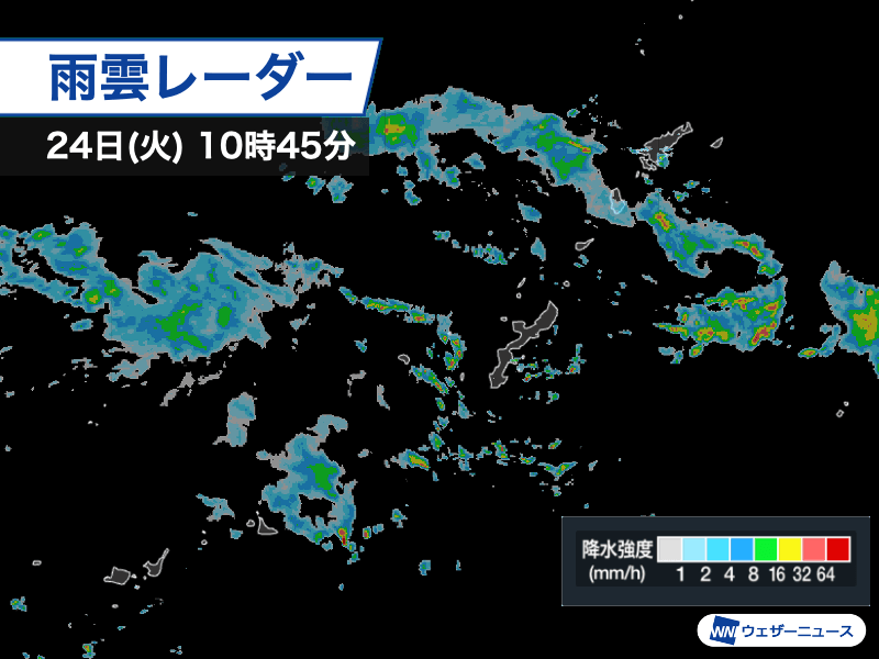 沖縄県宮古島市城辺では、10時34分までの1時間に12.0mmのやや強い雨を観測しました。