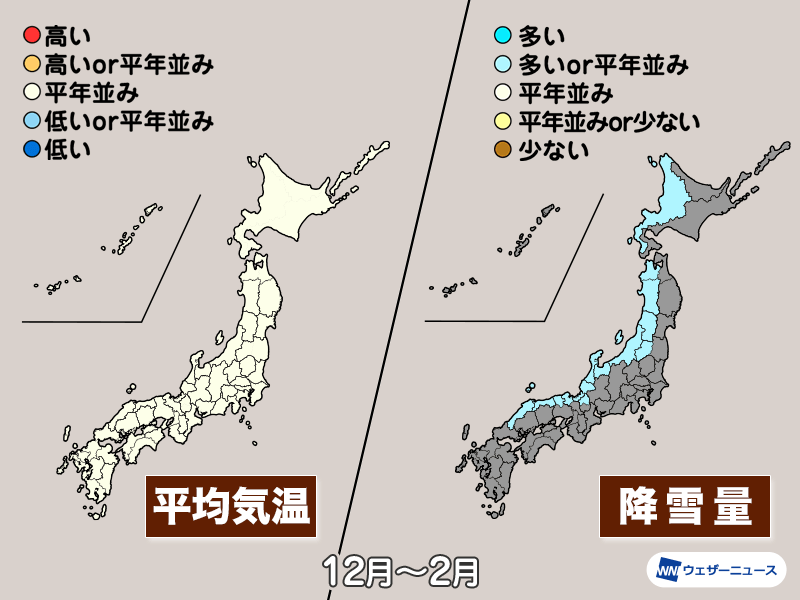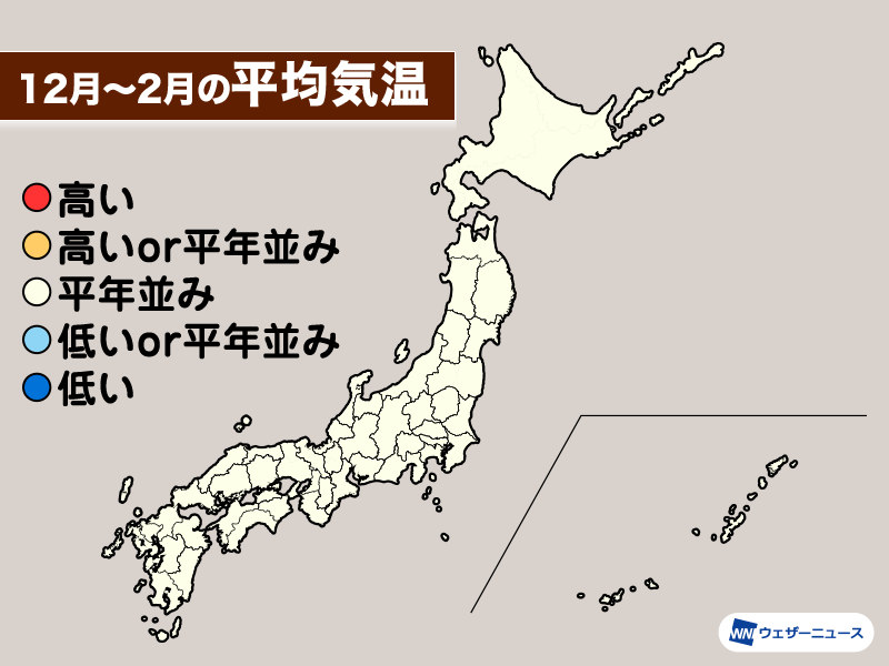 このため、東日本や西日本を中心に冬型の気圧配置が強まる時期があり、日本列島の上空には寒気が流れ込む予想です。冬の平均気温は全国的にほぼ平均並みになるとみられます。