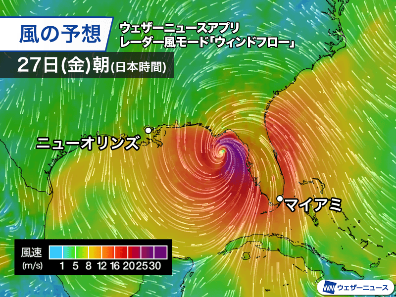 メキシコ湾東部は海面水温が30℃以上と高く、風の環境も発達に適しています。