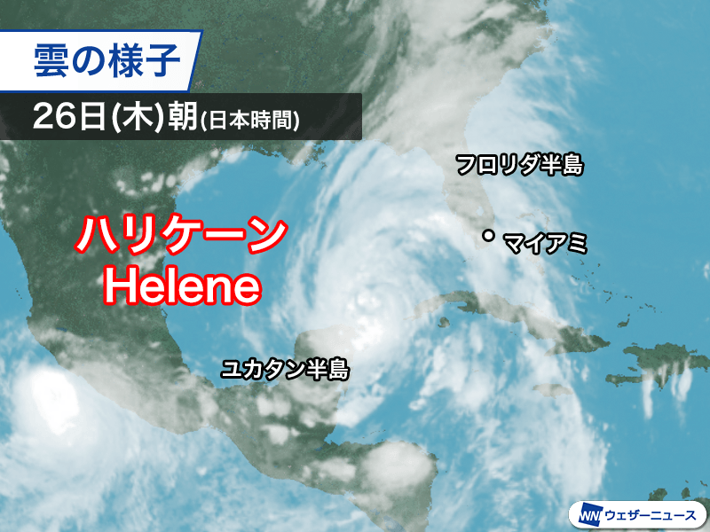 ハリケーンHereneは日本時間の26日(木)6時の時点で中心気圧が978hPa、中心付近の最大風速が40m/sと解析されています。衛星画像をみると、台風の雲の渦が非常に大きく、最も外側の雲はすでにフロリダ半島にかかり始めているほどです。