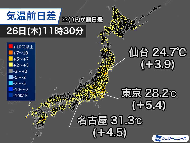 11時30分の気温の前日差をみると、特に関東甲信や東北の太平洋側で昨日よりも大きく上がっていて、東京都心は5.4℃高い28.2℃、仙台市は3.9℃高い24.7℃を観測しました。関東のウェザーニュースアプリ利用者からの体感報告では、「肌寒い」と回答した方がほとんどいなくなり、半数以上の方は暑さを感じています。