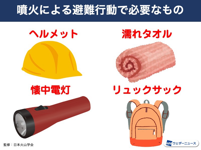 リスクを承知の上で、規制されていない火山へ訪れる際には、通常の登山用品に加えてヘルメット等を持参し、噴火に遭遇したときの行動を確認の上で行動してください。