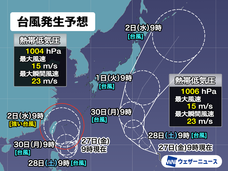9月27日(金)9時現在、沖縄の南とマリアナ諸島で発達中の熱帯低気圧について、気象庁はそれぞれ「24時間以内に台風に発達する見込み」と発表しました。