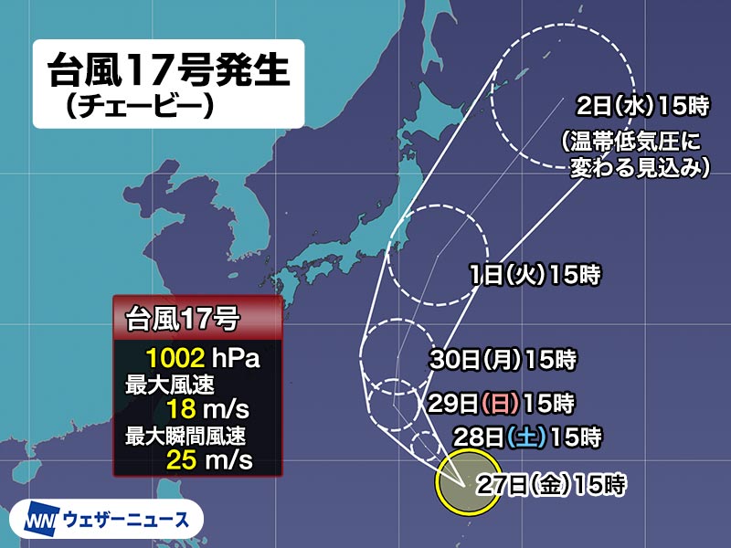 台風17号の進路予想を見ると、しばらくは北西に進んで29日(日)〜30日(月)頃に小笠原諸島の西を通過する予想です。父島や母島では波が高まり、進路次第では強風や雨などの影響がでる可能性があるため注意してください。