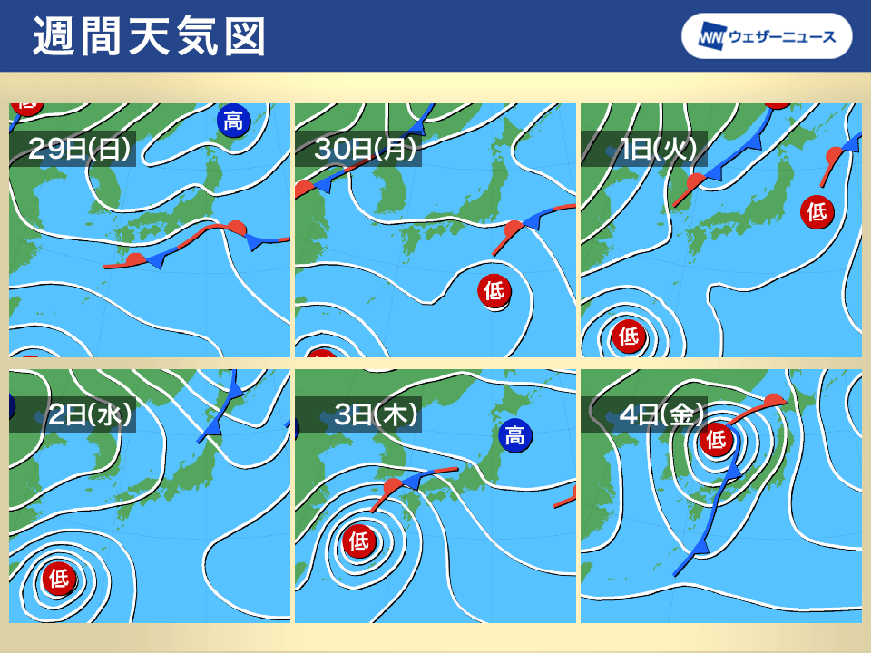 進路の予想を見ると、しばらくは北西に進んで小笠原方面に向かい、29日(日)から30日(月)にかけて最も近づく見込みです。小笠原諸島では高波などの影響が出る可能性があるため注意してください。
