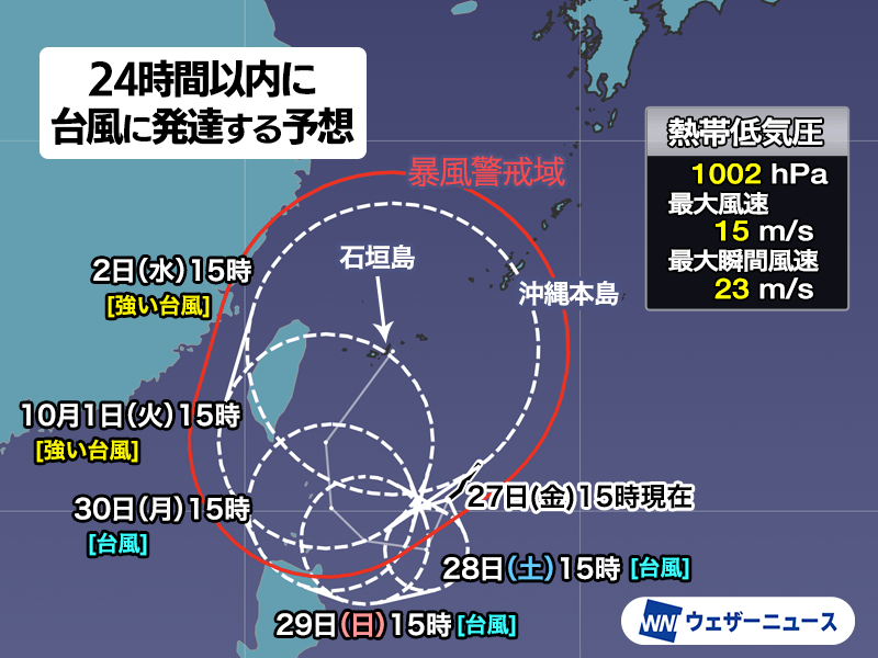 9月27日(金)15時、沖縄の南で発達中の熱帯低気圧について、気象庁は「24時間以内に台風に発達する見込み」と発表しています。先ほど台風17号が発生しましたので、次に発生すると今月8つ目となり、台風18号と呼ばれることになります。