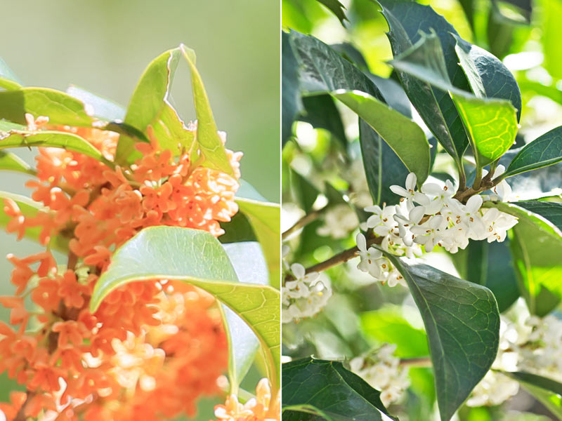 「花が咲いている期間は、花の色で見分けてください。その名の通り、金木犀の花の色は『金』を思わせる華やかなオレンジ色、銀木犀の花の色は『銀』を思わせる白に近い黄色か淡い黄色です。