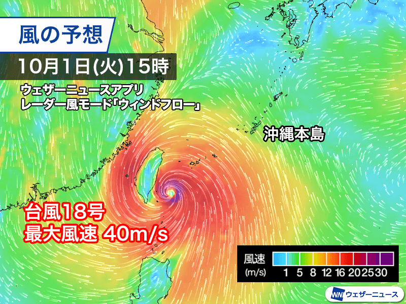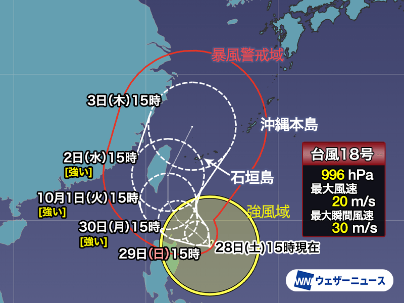 周辺の海面水温が高く、風の環境も発達に適していることから急速に勢力を強め、30日(月)には強い勢力、10月1日(火)には中心付近の最大風速が40m/sに達する予想です。