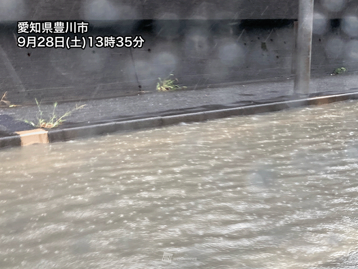 雨雲の一部は愛知県東部や静岡県にかかっていて、13時50分までの1時間には静岡県浜松市・三ヶ日で18.0mm、愛知県蒲郡市で11.5mmのやや強い雨を観測。解析雨量では1時間に80mm以上の猛烈な雨になっている所があるとみられます。