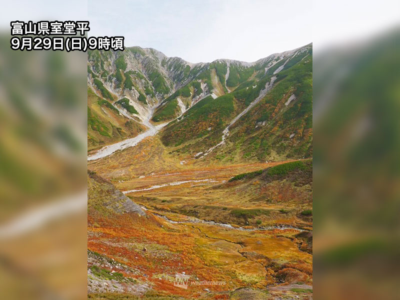 気温が下がり、富山県の立山黒部アルペンルートでは紅葉が色づき始めました。標高2,450mの室堂平では見頃を迎え、弥陀ヶ原付近でも色づきが始まっています。