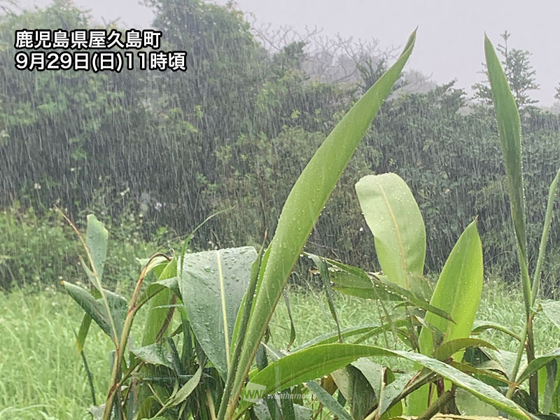 秋雨前線の発達した雨雲が流れ込み、鹿児島県屋久島の尾之間のアメダスでは10時20分までの1時間に35.0mmの激しい雨を観測しました。沖縄県名護でも22.5mmの強い雨を観測しています。
