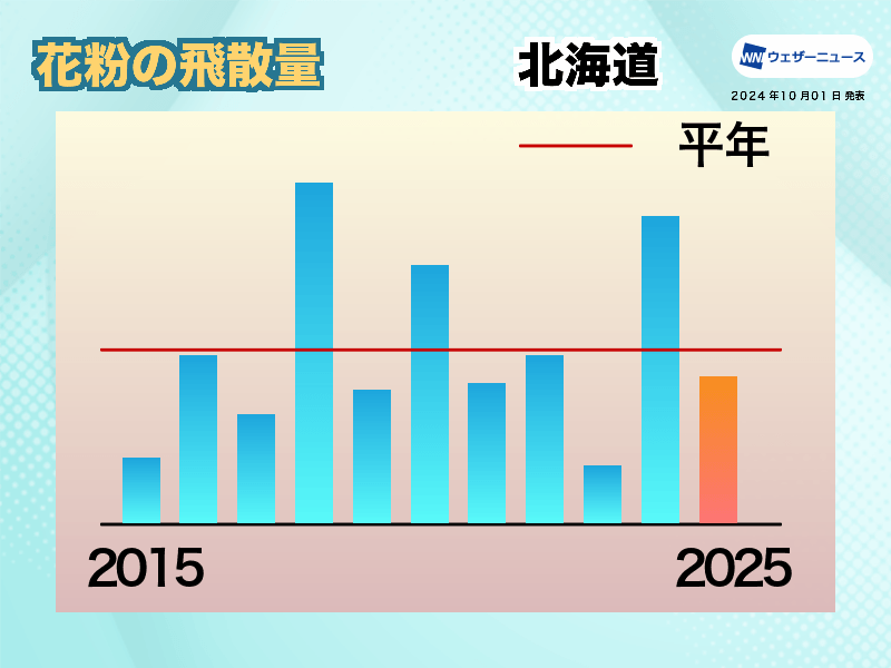 2024年の夏は暖かい空気に覆われて、気温は平年に比べてかなり高くなりました。日照時間も平年を上回ったところが多く、花粉の雄花の生長に適した天候となりました。また、2024年の花粉の飛散量は前年を下回ったものの、平年を上回りました。