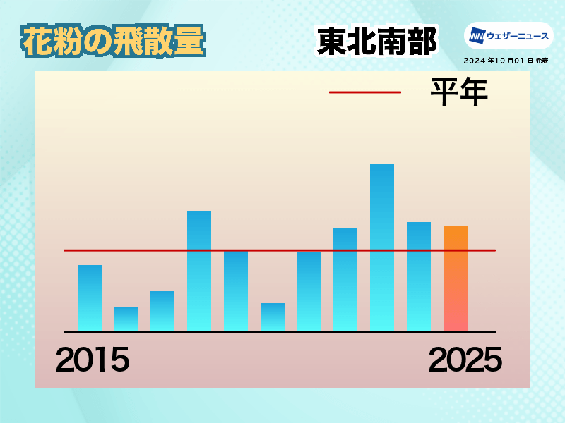 特に晴れて風の強い日には大量の花粉が飛散するため、しっかりと花粉対策をしてください。なお、東北南部ではスギ花粉の飛散が中心で、ヒノキ花粉の飛散は比較的少ない傾向です。