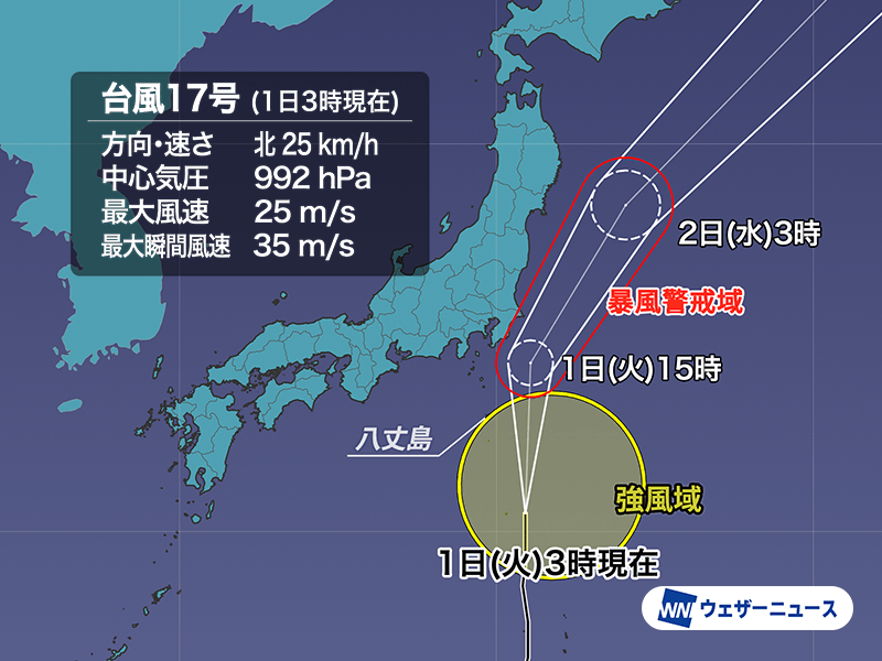 昨日、小笠原諸島に最接近した台風17号は北上を続け、伊豆諸島南部の一部が風速15m/s以上の強風域に入りました。