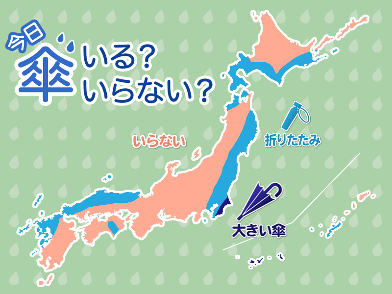 北海道は午前ほどにわか雨の可能性があり、山陰や四国の山沿いもにわか雨が心配です。九州は東シナ海側で遅い時間ほど急な雨にご注意ください。各地、外出の際は折りたたみ傘があると安心です。