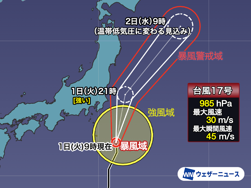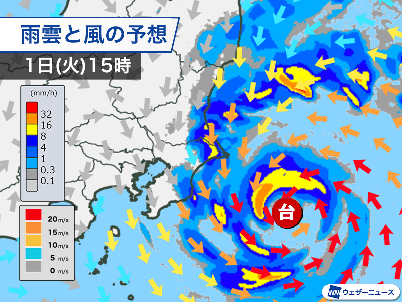 台風は北上を続けて今日の午後に関東に最も近づき、夜には温帯低気圧に変化する過程で強い勢力になる見込みです。その後は東寄りに進路を変えて陸地からは次第に離れ、明日2日(水)には温帯低気圧に変わる予想となっています。