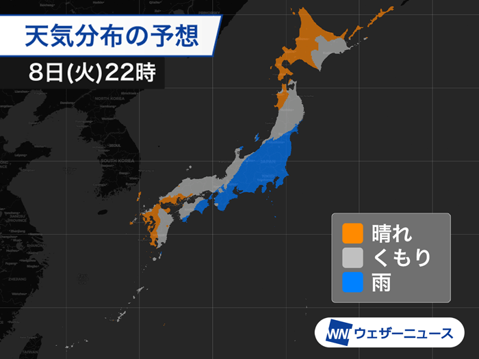 今日8日(火)の夜は前線が本州の南岸に停滞して、東北南部〜近畿、四国の各地は雲が広がります。東日本の太平洋側を中心に雨が降り、流星群の観測にはあいにくの天気となってしまいます。
