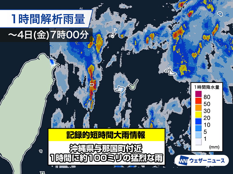 沖縄県与那国町付近では7時00分までの1時間に約100mmの猛烈な雨が降ったとみられ、気象庁は記録的短時間大雨情報を発表しました。大雨による低地の浸水や土砂災害等に警戒してください。