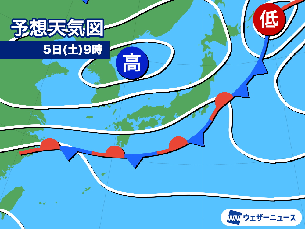 明日5日(土)は秋雨前線が本州の南に停滞します。