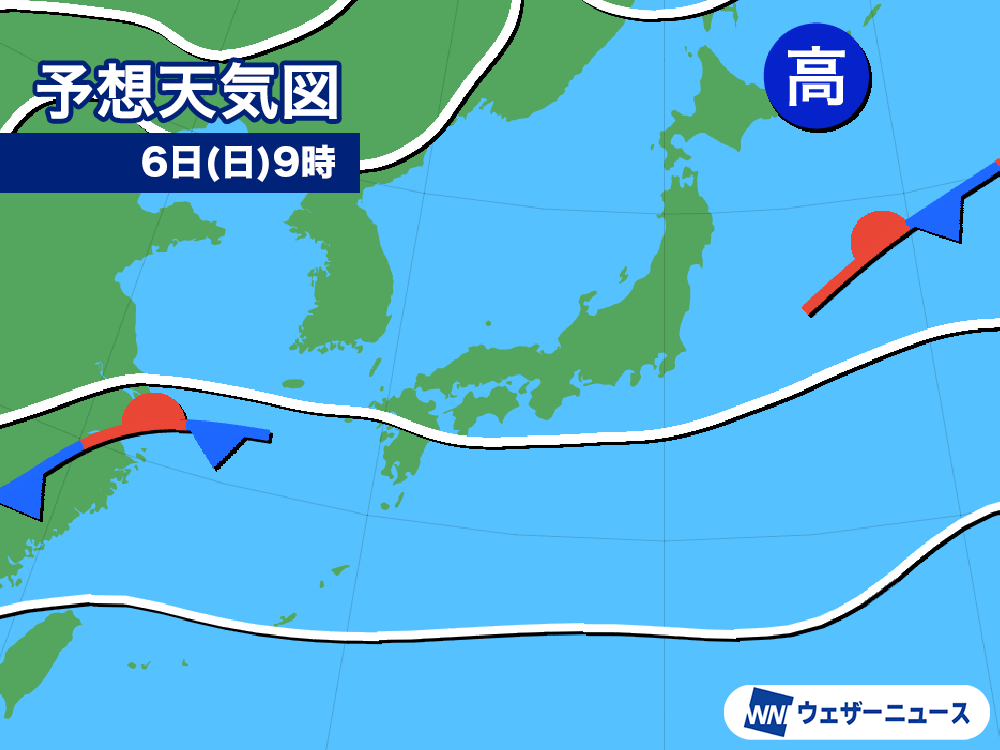 明後日6日(日)は南海上の前線が弱まり不明瞭になるものの、西からは再び前線がのびてきます。