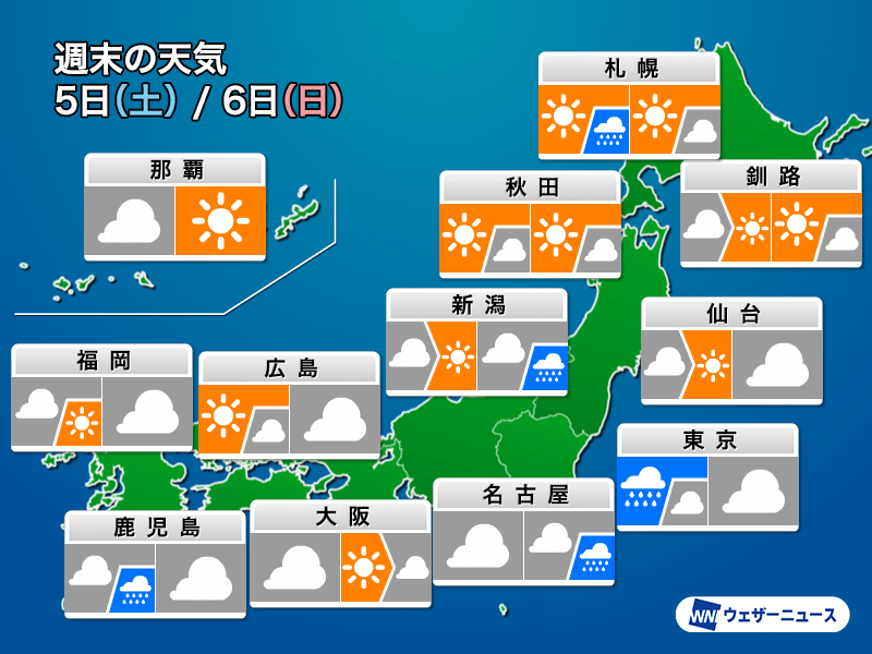 九州から東北南部にかけては雲が広がり、所々で雨が降る見込みです。広範囲での天気の崩れはないものの、にわか雨に備えて折りたたみ傘があると安心です。特に山沿いでは急な雨の強まりにお気をつけください。南から暖かな空気が北上し、土曜日より蒸し暑く感じられそうです。