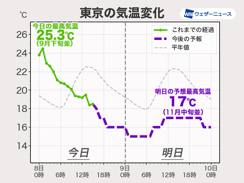 今日8日(火)の関東は、朝から気温がどんどん下がりました。東京都心の最高気温は未明に観測された25.3℃ですが、昼間は気温が下がり15時の気温は18.5℃となっています。午後は関東各地で20℃以下となり、空気が冷たく感じられました。