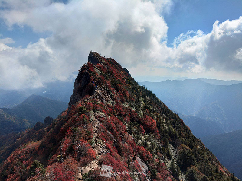 石鎚山(1982m)は西日本最高峰の山で、日本百名山にも数えられています。山頂付近の切り立つような岩場を彩る紅葉はここでしか見られない絶景です。山頂付近は例年10月上旬頃から色づき始め、麓へとだんだん見頃エリアが移っていきます。
