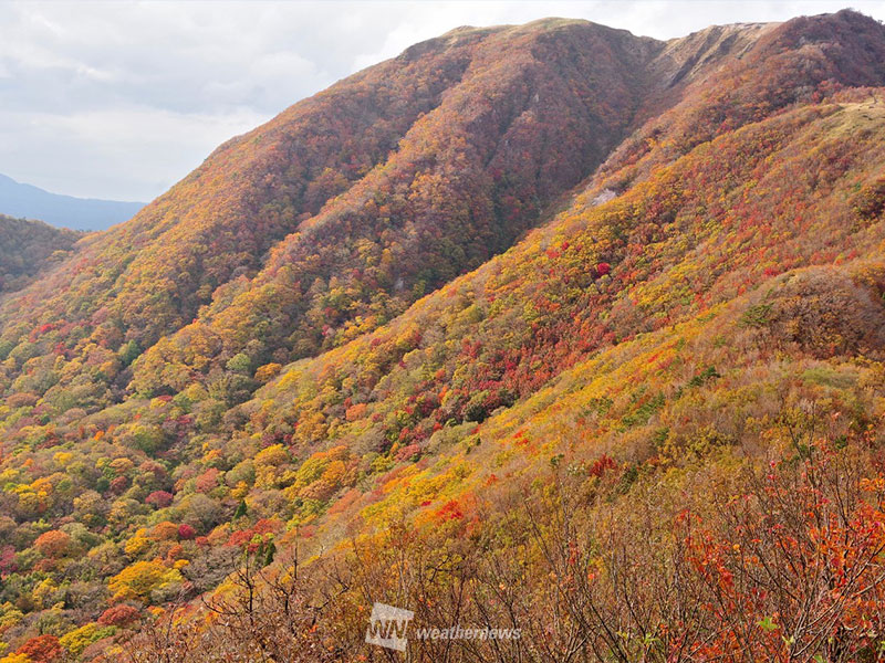 鳥取県の大山(1729m)は、日本百名山にも数えられる、中国地方最高峰の山です。色濃い緑の夏山の姿から、秋は朱色や黄色、オレンジに美しく染まります。例年10月下旬頃から見頃を迎えます。