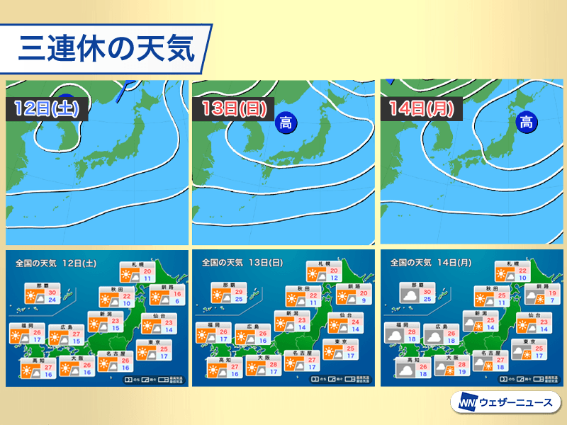 12日(土)からの三連休は天気の主役が秋雨前線から移動性高気圧へと変わります。全国の広い範囲で秋晴れとなり、行楽日和となる見込みです。