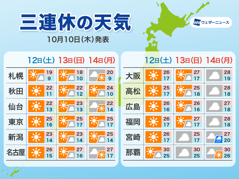 三連休は前半ほど広範囲で行楽日和 最終日は西日本から天気が下り坂に