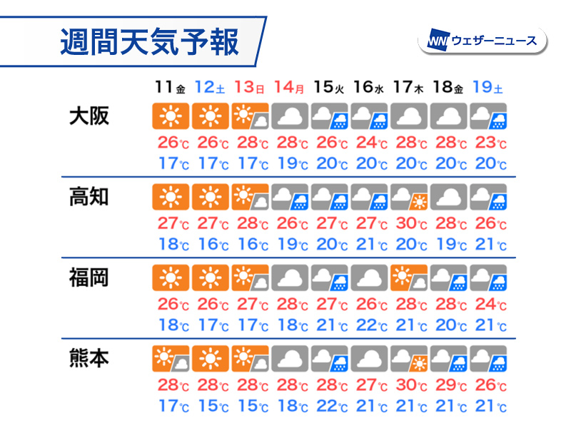 10月中旬の平年気温が24℃の福岡では来週も25℃を超える日が続き、14日(月)の予想最高気温は9月中旬並みの28℃です。