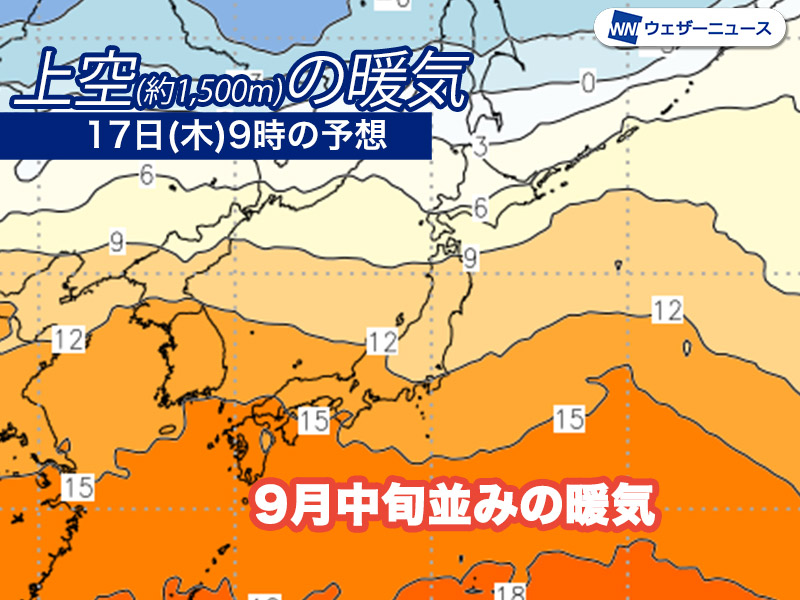 熊本や高知では17日(木)の予想最高気温が30℃で真夏日となる予想。来週は九州や四国の上空約1,500mに15℃という夏の終わりくらいの暖気が北上する影響でこの時期としては記録的な暑さになる可能性があります。