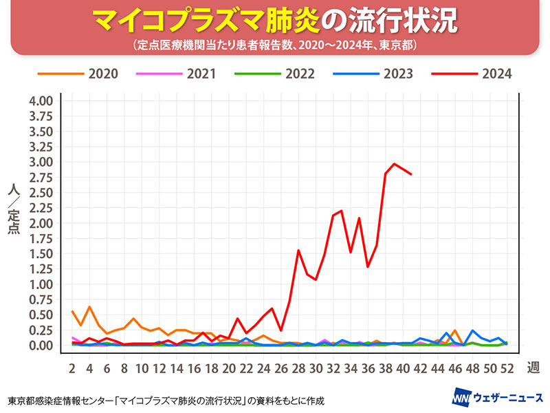 東京都感染症情報センターが10月17日に公表した2024年第41週(10月7日~10月13日)のマイコプラズマ肺炎の患者数は1医療機関あたり2.88人。過去最多を2週連続で更新した第39週の2.96人(計74人)からやや下降傾向にあるものの、依然として高水準が続いています。