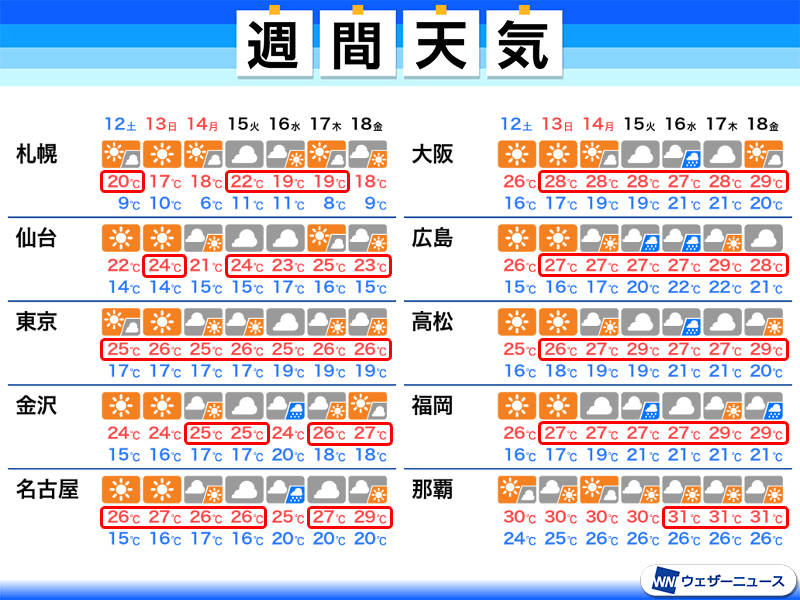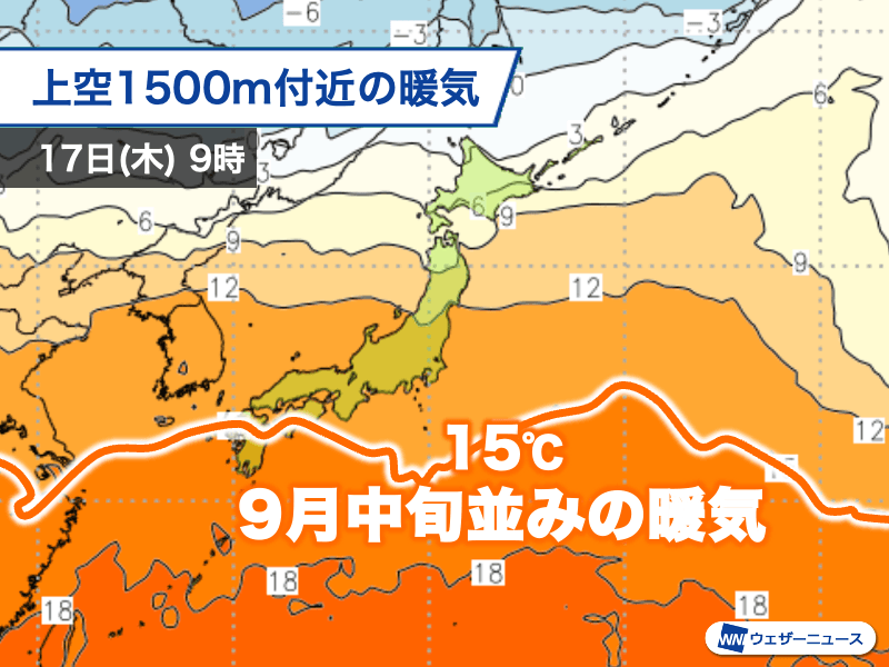 ただ、15日(水)の予想最高気温は9月中旬並みの22℃です。この時期としては異例の暖かさとなる可能性があります。