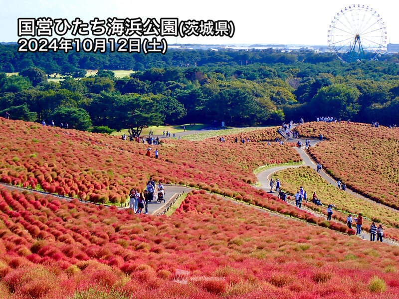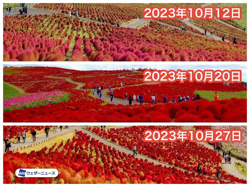 今年は、昨日12日(土)のリポートで、すでにコキアが見事なグラデーションを見せていることが確認できます。このため、見頃のピークは10月19日(土)前後になる見込みです。昨年の状況を参考にすると、今月末まで真っ赤に染まったコキアの美しい景色を楽しむことができそうです。